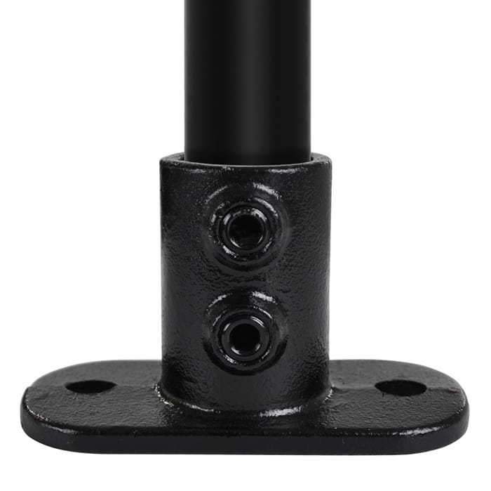 Stolpfot. Stark bottenplatta för att stödja vertikal stolpe. Vertikal bred ribba med två ställskruvar ökar klämmans hållfasthet. Fästhålen i basflänsen ska vara i linje med den applicerade belastningen.